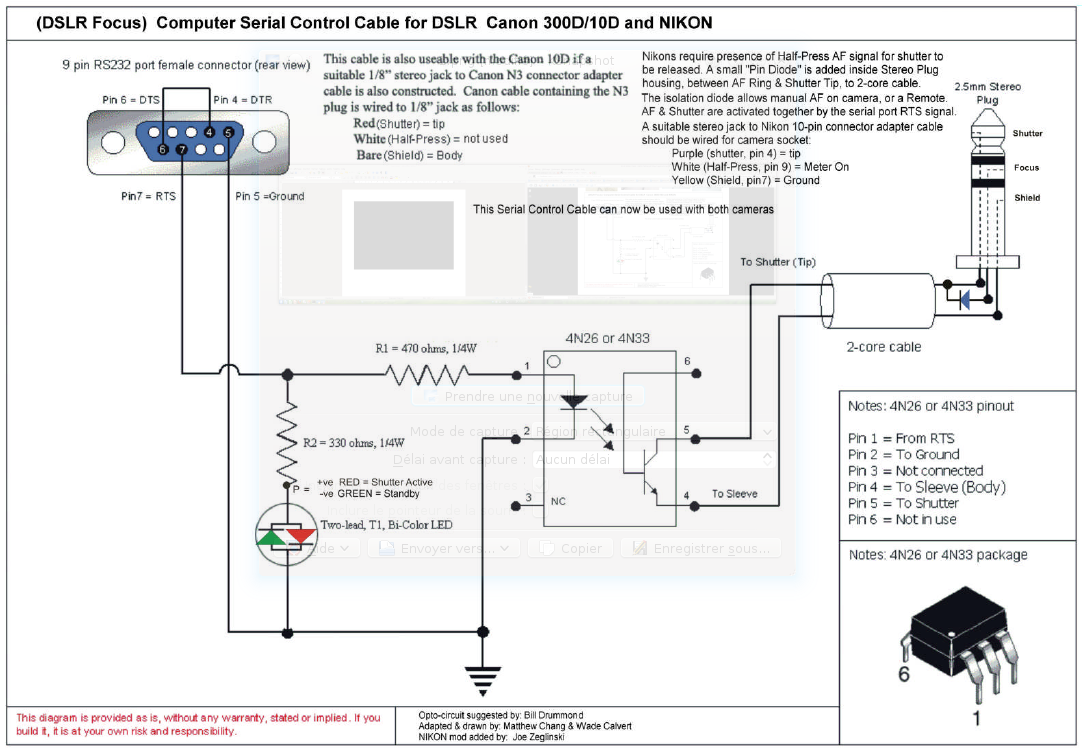 Nous allons fabriquer un câble série pour piloter l'appareil photo, voici le site à partir duquel j'ai fabriqué mon propre câble (Je ne pourrai en aucun cas être tenu responsable de soucis suite à la fabrication ou l'utilisation de ce câble). Il y a becaoup de variantes, mais cette version semble plus sécurisée.